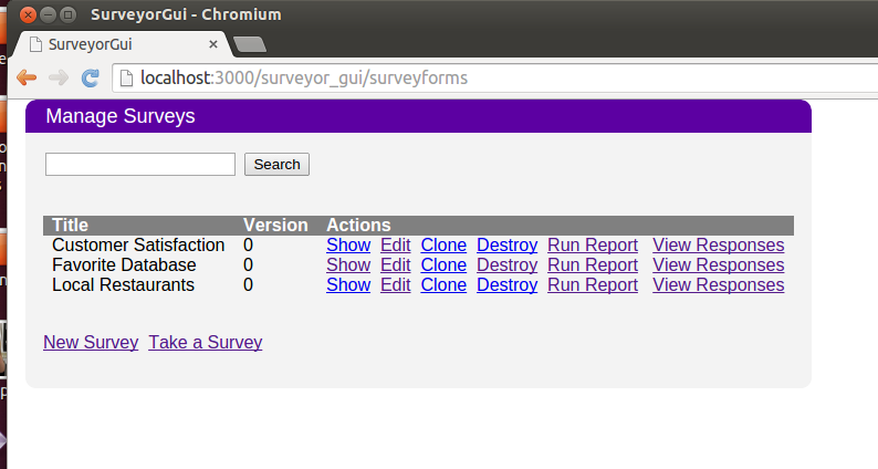 Surveyor does some things really well. Surveyor can be used to build rich surveys with a wide variety of questions types, and it provides a web page for users to take those surveys. However, it lacks two key abilities - the ability to build and edit surveys using a browser and to report on survey results without additional coding. In order to build a survey using Surveyor, you need to create a text file using Surveyor's DSL, and then call a Rake task to parse it.