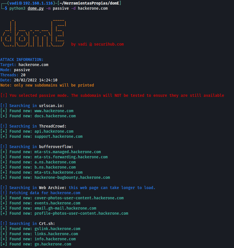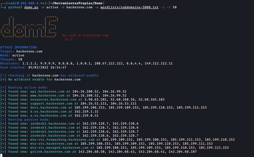 python dome.py -m active -d domain -w wordlist.txt -p 22,80,3306You can contact me at vadi@securihub.com