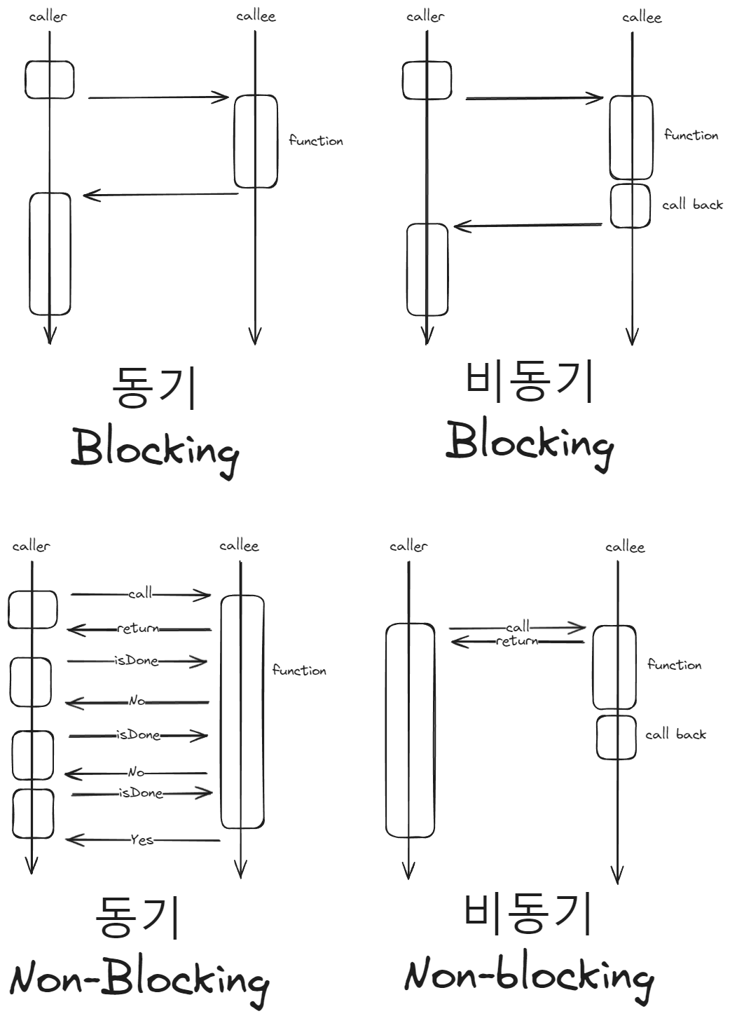 비동기에서 caller는 callee의 결과에 관심이 없으며 callee가 그 결과를 이용해서 callback을 수행한다.