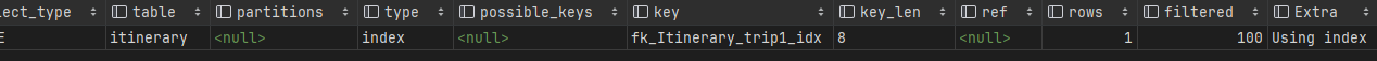 EXPLAIN SELECT id FROM itinerary limit 3;위와 같이 EXPLAIN후 실행할 쿼리를 작성하면 쿼리 계획이 나오는데