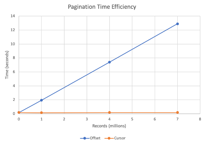 row가 많으면 많을 수록 뒤에 내용을 조회할 수록 Offset방식과 Cursor 방식의 속도차이는 점점 커진다. 따라서 Cursor 방식을 사용하면 Offset문제에서 발생한 속도문제를 해결할 수 있다.