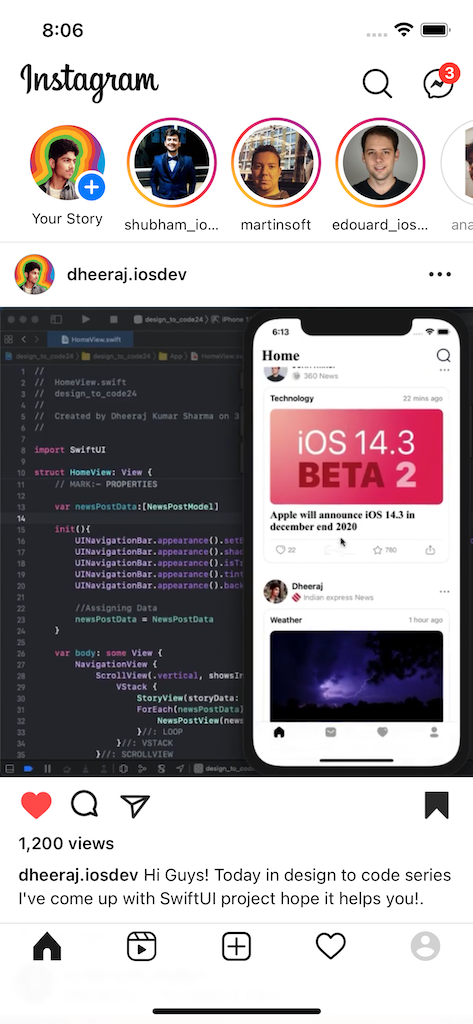Instagram-Clone-in-SwiftUI This is a series of learning experience in which i regularly try to create instagram clone using swiftUI and update it as well! Glance of Updates Stuck Somewhere or having trouble ? Drop me mail @ [email protected] Do you like my contribution to community? Go Spread a word! Just give it a star ⭐️ and spread the word! Credits © Dheeraj kumar sharma - 2022