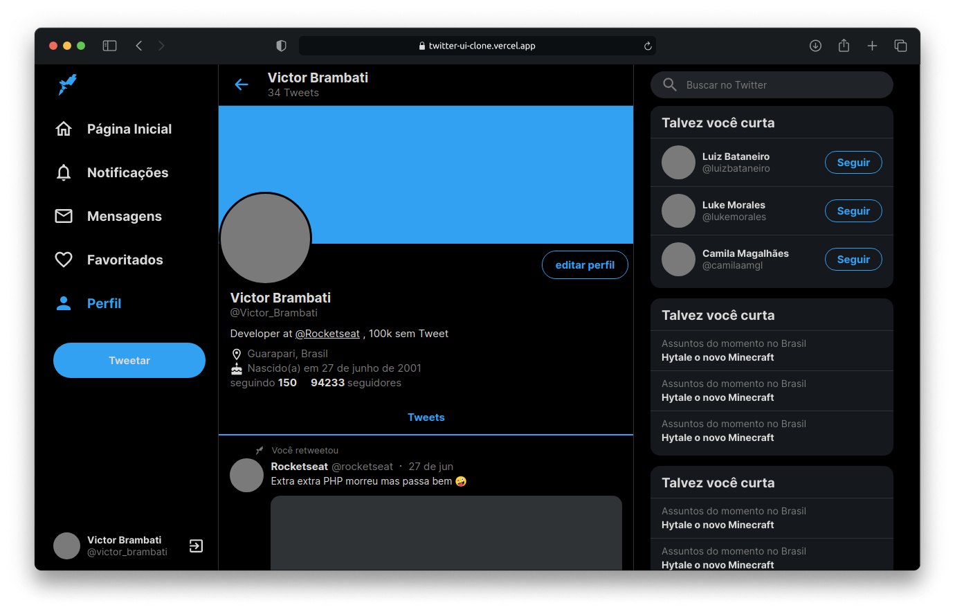 Twitter UI Clone Done with the help of Rocketseat and redesign with figma. Dark mode. 🚀 Technologies This project is for study purposes with the following technologies: ReactJS Typescript styled-components VS Code with EditorConfig and ESLint Made with ♥ by Victor Brambati 👋 Get in touch!