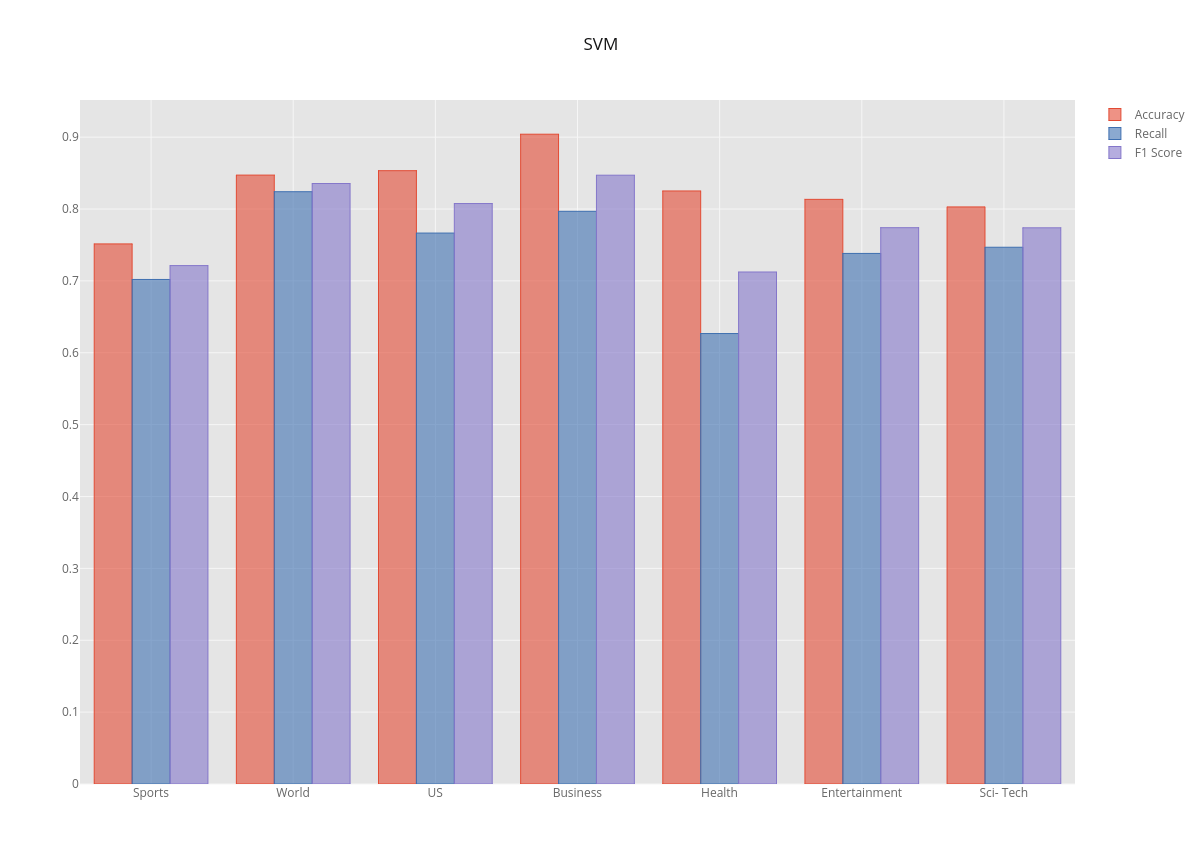 We evaluate each classifier's ability to select the appropriate category given an article’s title and a brief article description. The confusion matrix is created to explore the results and calculate the metrics.