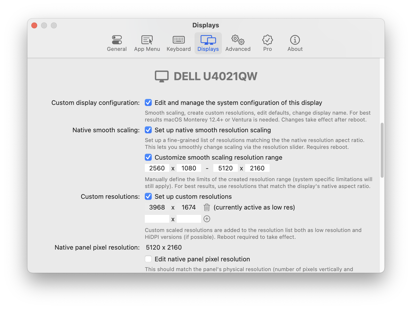 3968x1674for example. However when enabling custom resolutions the max it seems to allow me to set is3840x1620despite having added the3968x1674resolution manually as a custom resolution.Potentially related to this as well, I also tried to set a custom range for the smooth resolution scaling but the menu is still showing me options outside of the specified range.