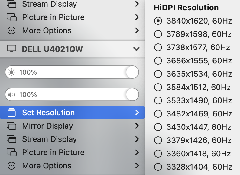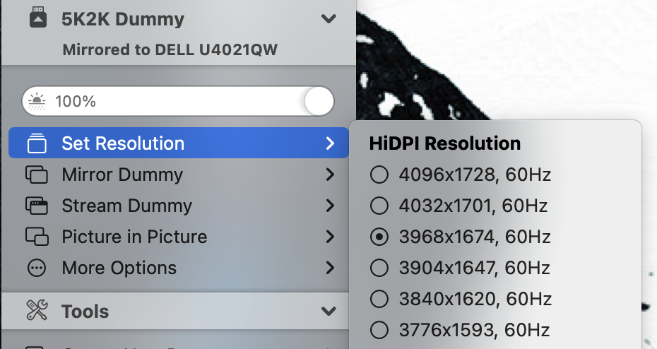 Hi there - it seems you are using an M1 mac that has a Pro (or Max/Ultra) chip inside. These support a max. HiDPI width of 3840 (7680 pixels). This is a problem especially for 5K ultrawide users as there is a gap between 4K and 5K horizontal resolutions (5K being available as LoDPI only). See this for more info: #735 For the time being if you want HiDPI resolutions with width exceeding 3840, you have to use the dummy mirroring approach (with all its shortcomings). |