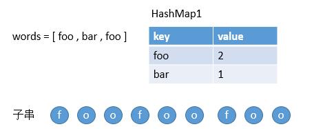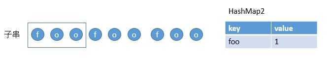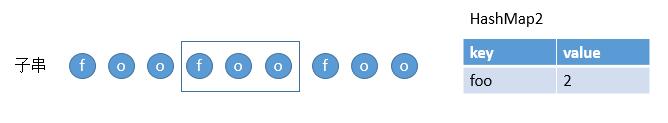 第三个单词也在 HashMap1 中,然后把 foo 存到 HashMap2 中,因为之前已经存过了,所以更新它的 value 为 3,然后继续比较此时 foo 的 value 和 HashMap1 中 foo 的 value,3 > 2,所以表明该字符串不符合。然后判断下个子串就好了。