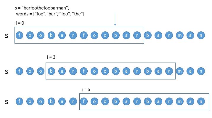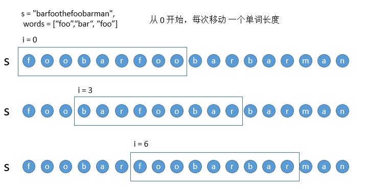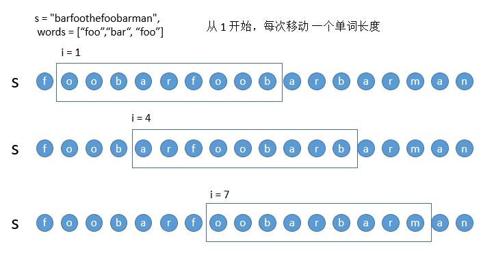 在解法一中,对于 i = 3 的子串,我们肯定是从第一个 foo 开始判断。但其实前两个 foo 都不用判断了 ,因为在判断上一个 i = 0 的子串的时候我们已经判断过了。所以解法一中的 HashMap2 每次并不需要清空从 0 开始,而是可以只移除之前 i = 0 子串的第一个单词 bar 即可,然后直接从箭头所指的 foo 开始就可以了。