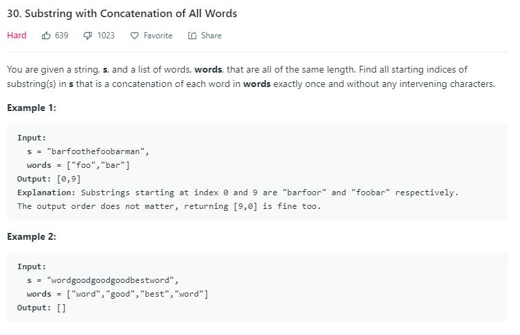 public List<Integer> findSubstring(String s, String[] words) { List<Integer> res = new ArrayList<Integer>(); int wordNum = words.length; if (wordNum == 0) { return res; } int wordLen = words[0].length(); HashMap<String, Integer> allWords = new HashMap<String, Integer>(); for (String w : words) { int value = allWords.getOrDefault(w, 0); allWords.put(w, value + 1); } //将所有移动分成 wordLen 类情况 for (int j = 0; j < wordLen; j++) { HashMap<String, Integer> hasWords = new HashMap<String, Integer>(); int num = 0; //记录当前 HashMap2(这里的 hasWords 变量)中有多少个单词 //每次移动一个单词长度 for (int i = j; i < s.length() - wordNum * wordLen + 1; i = i + wordLen) { boolean hasRemoved = false; //防止情况三移除后,情况一继续移除 while (num < wordNum) { String word = s.substring(i + num * wordLen, i + (num + 1) * wordLen); if (allWords.containsKey(word)) { int value = hasWords.getOrDefault(word, 0); hasWords.put(word, value + 1); //出现情况三,遇到了符合的单词,但是次数超了 if (hasWords.get(word) > allWords.get(word)) { // hasWords.put(word, value); hasRemoved = true; int removeNum = 0; //一直移除单词,直到次数符合了 while (hasWords.get(word) > allWords.get(word)) { String firstWord = s.substring(i + removeNum * wordLen, i + (removeNum + 1) * wordLen); int v = hasWords.get(firstWord); hasWords.put(firstWord, v - 1); removeNum++; } num = num - removeNum + 1; //加 1 是因为我们把当前单词加入到了 HashMap 2 中 i = i + (removeNum - 1) * wordLen; //这里依旧是考虑到了最外层的 for 循环,看情况二的解释 break; } //出现情况二,遇到了不匹配的单词,直接将 i 移动到该单词的后边(但其实这里 //只是移动到了出现问题单词的地方,因为最外层有 for 循环, i 还会移动一个单词 //然后刚好就移动到了单词后边) } else { hasWords.clear(); i = i + num * wordLen; num = 0; break; } num++; } if (num == wordNum) { res.add(i); } //出现情况一,子串完全匹配,我们将上一个子串的第一个单词从 HashMap2 中移除 if (num > 0 && !hasRemoved) { String firstWord = s.substring(i, i + wordLen); int v = hasWords.get(firstWord); hasWords.put(firstWord, v - 1); num = num - 1; } } } return res; }