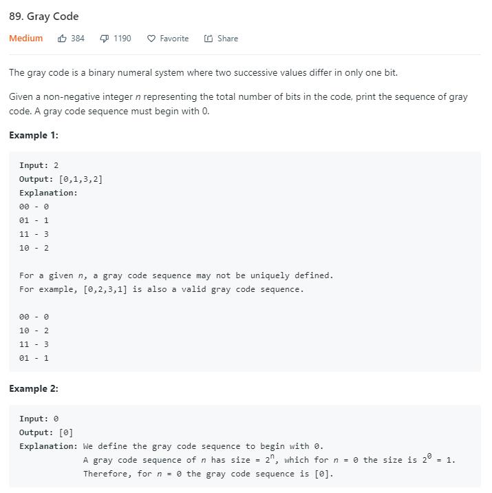 解法一我觉得,在不了解格雷码的情况下,还是可以想到的,下边的话,应该是之前了解过格雷码才写出来的。看下维基百科提供的一个生成格雷码的思路。