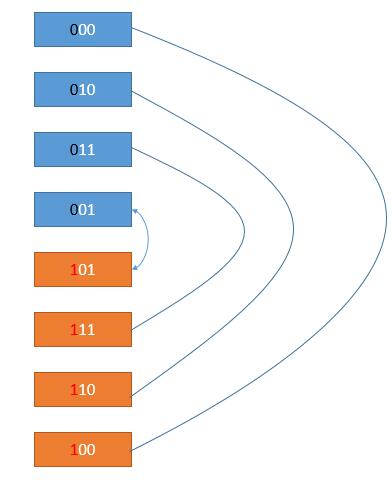接下来,为了使得第 6 行和第 5 行只有一位不同,由于第 5 行拉的第 4 行的低位,而第 4 行和第 3 行只有一位不同。所以第 6 行可以把第 3 行的低位拿过来。其他行同理,如下图。