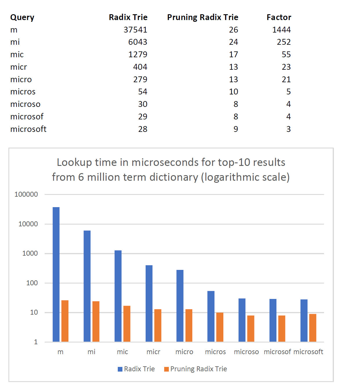 The Pruning Radix Trie is up to 1000x faster than an ordinary Radix Trie.