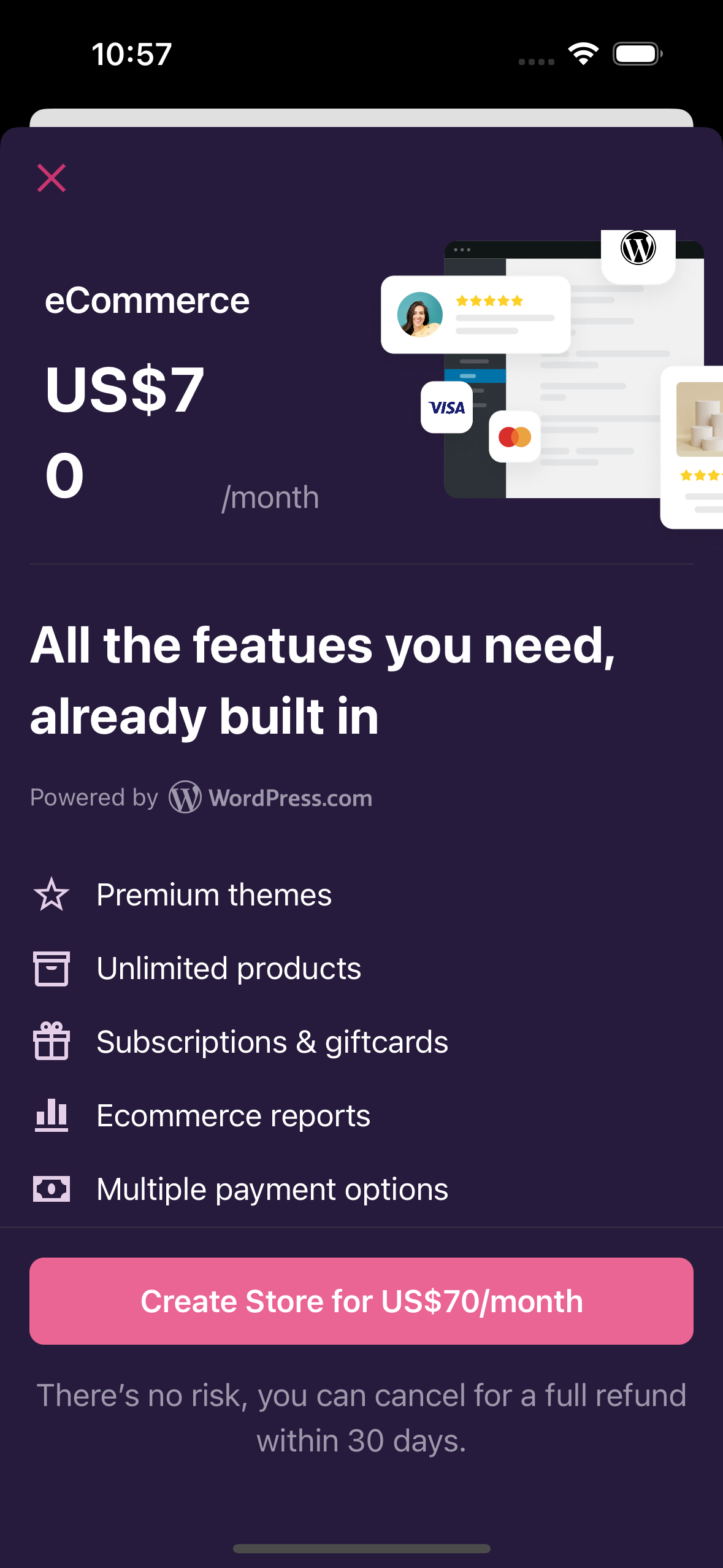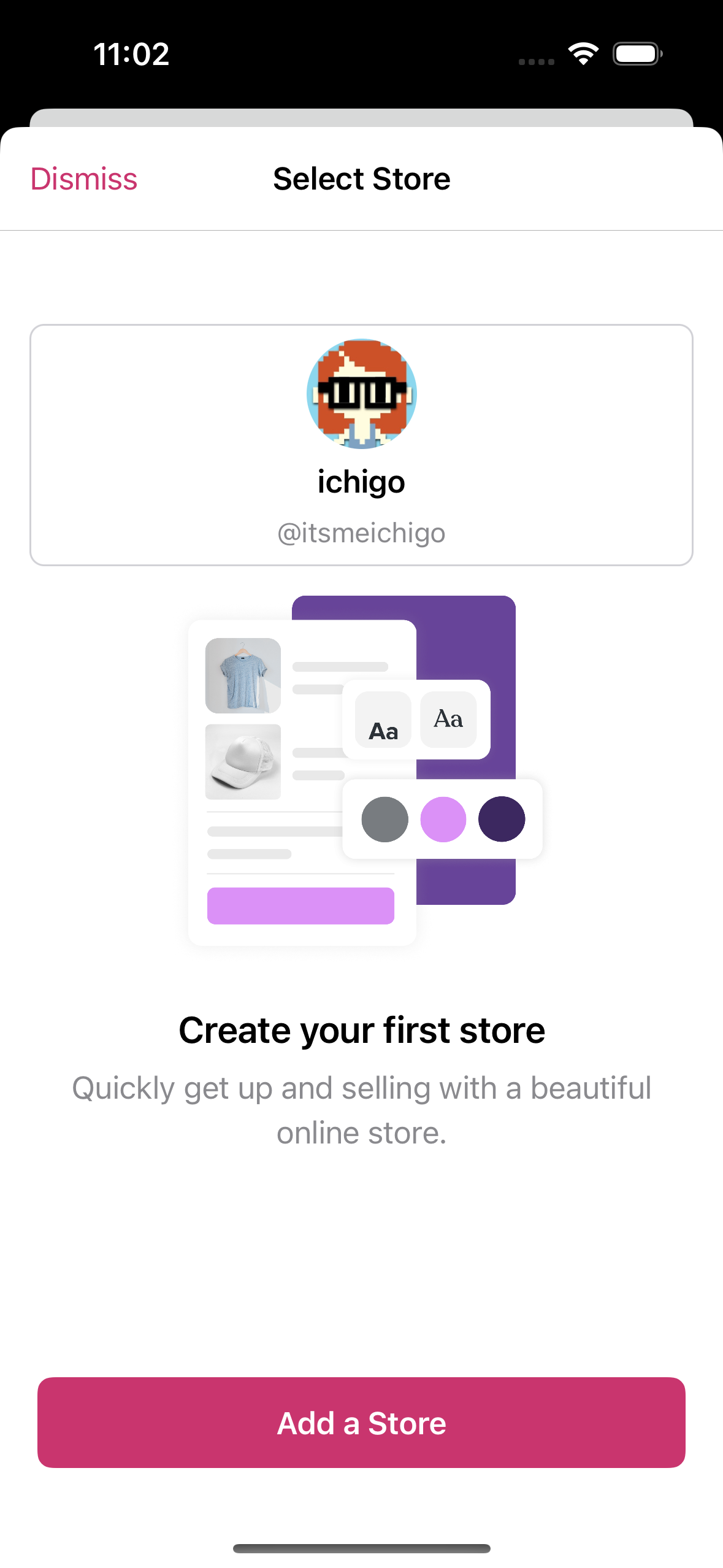 Switch store+ Add a storeCreate a new store--> an in-progress modal should be shown briefly, then dismissed. the store name form is then presentedContinuewhen ready --> the store name should be used for the initial domain query in the next screenContinue--> a free Simple site should be created, and a store summary screen is shown with the store name and site slugContinue to payment--> the eCommerce plan should be shown in the currency of the WPCOM accountCreate Store for */month--> an in-progress screen should be shown about creating the store. after the site becomes available as a Jetpack site in the/me/sitesresponse (about 30s-1m), the success screen should be shownManage My Storeto continue to the new site in the app --> the new site should be an Atomic site with WC activated, where you can add a product successfullyScreenshots