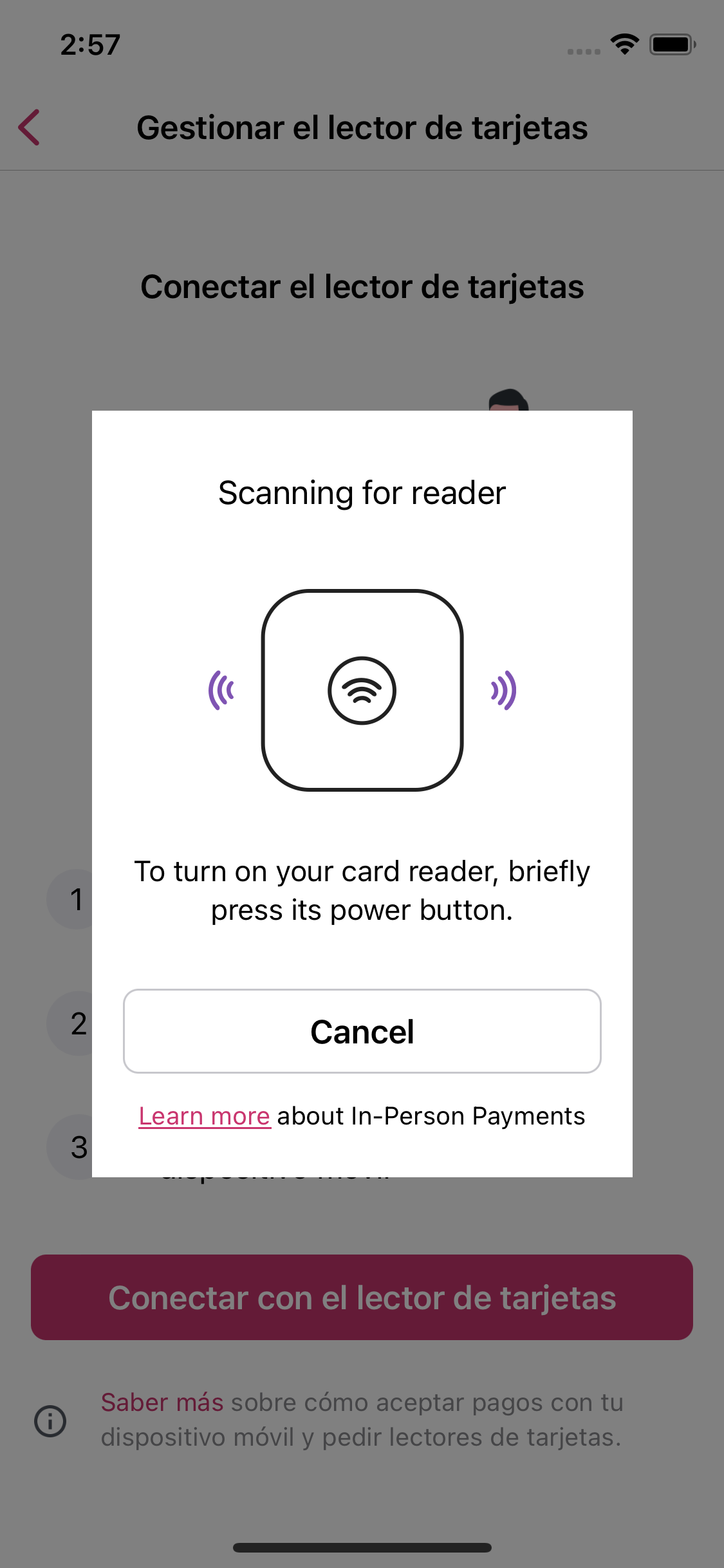 Learn More about In-Person Paymentsbutton. This is more easily checked by commenting outdiscoveredReadersSubject.send(wooReaders)here, so the flow doesn't move forward to the next step.Cancelbutton when the app prompts to connect a reader.I'd left out of this PR further improvements like moving button
