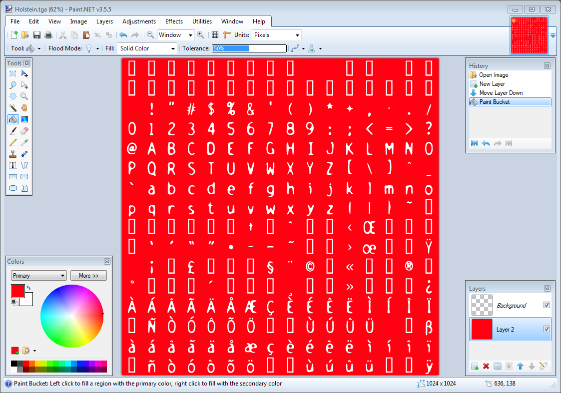 该纹理由CBFG生成。CBFG是一种由字体生成纹理的工具。然后把纹理加载到Paint.NET(红色背景仅为了方便观察,其实是透明的)。