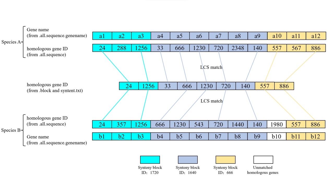 1720:1 24 1256 1640:1 33 666 1230 720 140 666:1 557 886 # Correspondence between synteny blocks ID and homologous genes in blocks.txtFig. 1 Construction of complete homologous gene sequences in synteny blocks.1720:1 24 288 1256 1640:1 366 666 1230 720 2348 140 666:1 557 567 886 # After LCS matching, The complete homologous genes ID of the synteny blocks in species A ---------------------------------------------------- 1720:1 a1 a2 a3 1640:1 a4 a5 a6 a7 a8 a9 666:1 a10 a11 a12 # After LCS matching, the complete homologous gene name of the synteny blocks in species A1720:1 24 357 1256 1640:1 666 1230 543 720 1440 140 666:1 557 886 # After LCS matching, The complete homologous genes ID of the synteny blocks in species B ---------------------------------------------------- 1720:1 b1 b2 b3 1640:1 b4 b5 b6 b7 b8 b9 666:1 b11 b12 # After LCS matching, the complete homologous gene name of the synteny blocks in species B
