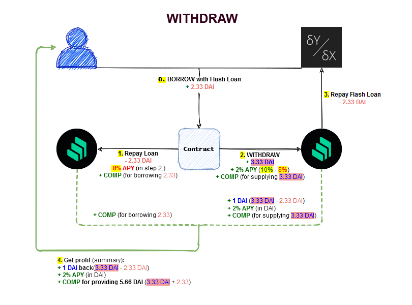 Yield Farming on Compound boosted with dYdX flash loan 📃 Instructions to run 0. Install dependencies in project directory (works with node v12.10.0) npm i 1. Install ganache-cli (globaly) npm i -g ganache-cli 2. In 1st terminal window fork mainnet with ganache-cli ganache-cli -p 7545 -f <https://YOUR_ETH_PROVIDER> 3. In 2nd terminal window run tests trufle test !Note: To reset data, restart ganache-cli after each test. 🔧 Deposit: 🔧 Withdraw: