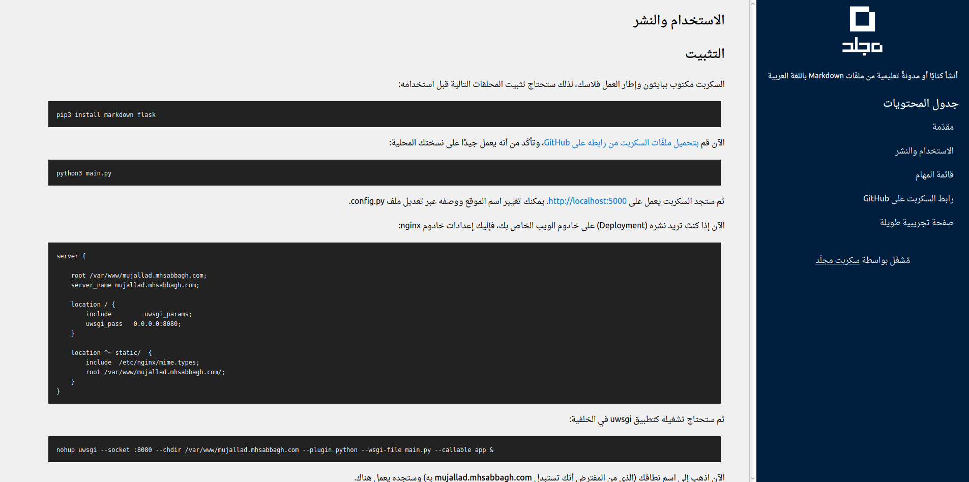 إذا حاولت من قبل البحث عن طريقة لجعل Gitbook يدعم العربية ولم تجد، أو إذا ما كنت قد بحثت عن أي سكربت محتوى بسيط يدعم اللغة العربية ليقرأ ملفّات Markdown ويعرضها على شكل كتاب ولم تجد كذلك، فحينها ستسرّ عندما تتعرف إلى سكربت مجلّد.