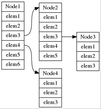 node2 [shape=record, label="<f0> Node2 | <f1> elem1 | <f2> elem2 | <f3> elem3 | <f4> elem4 | <f5> elem5 "];