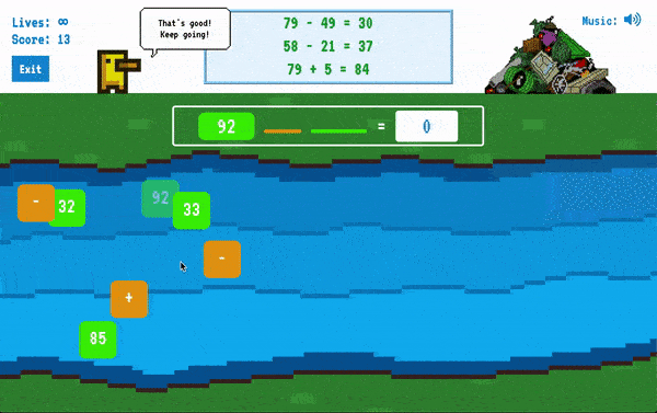 A web-based game that lets children practice forming and solving basic mathematical expressions by "cleaning the river"